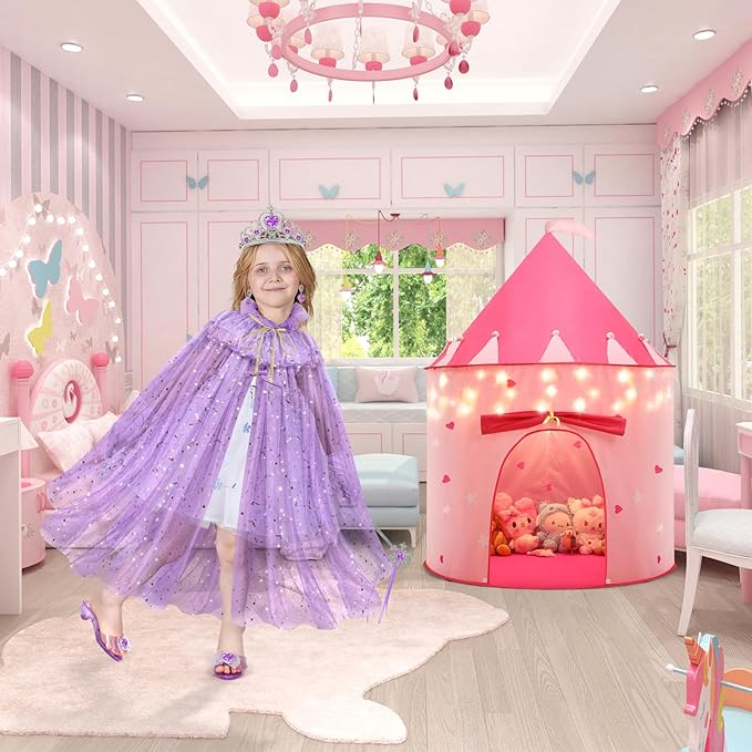WTOR 15Pcs Princess Castle Play Tent Dress Up with LED Glow in The Dark Stars for Little Girls-Princess Dress Up Cape with Crown,Girl Play Tent/House Toy for Indoor & Outdoor Use (Purple)