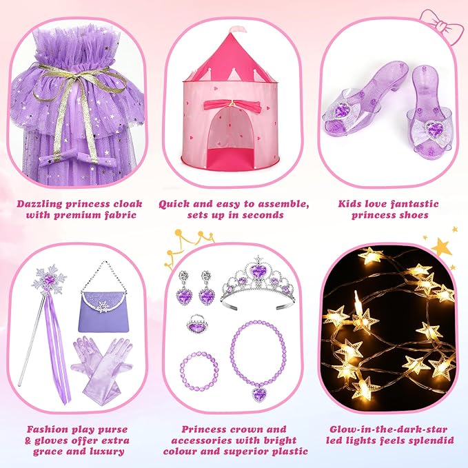 About This Fantastic 15Pcs Princess Castle Play Tent Set :1 castle tent ,star led lights,princess cape,1 toddler sized heel play... Read more