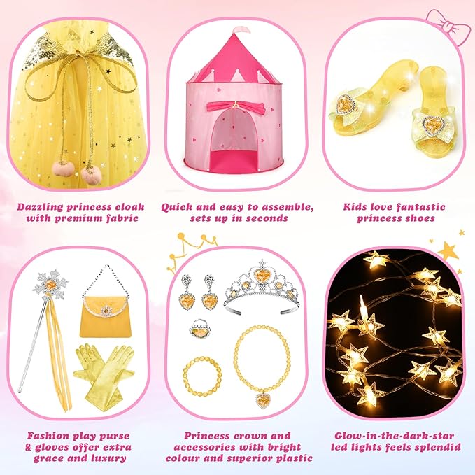 WTOR 15Pcs Princess Castle Play Tent Dress Up with LED Glow in The Dark Stars for Little Girls-Princess Dress Up Cape with Crown,Girl Play Tent/House Toy for Indoor & Outdoor Use (Yellow)