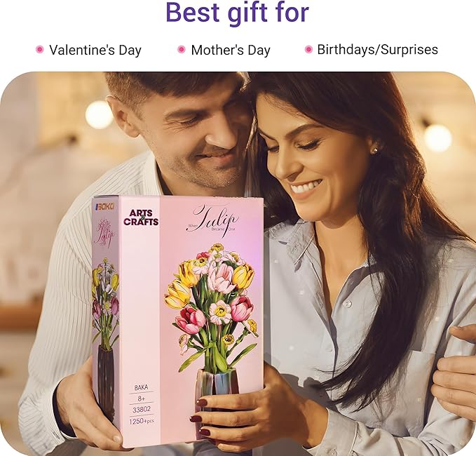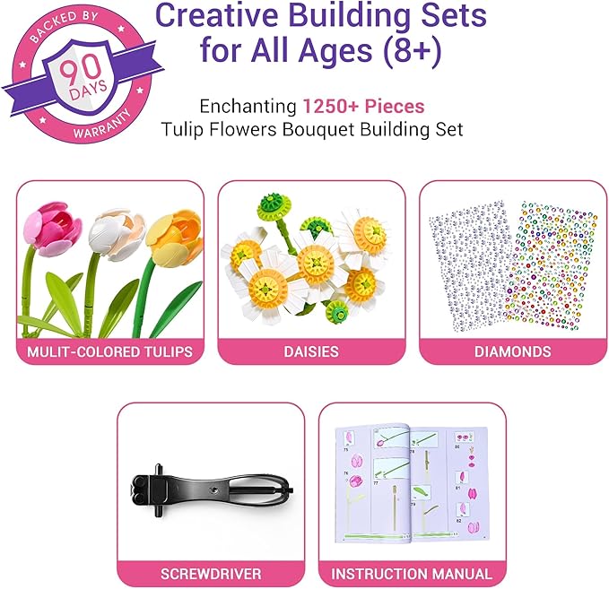 Building Block Flower Bouquet Set, 1250 Pieces, Artificial Tulips and Daisies with Vase, Home Decor Gift