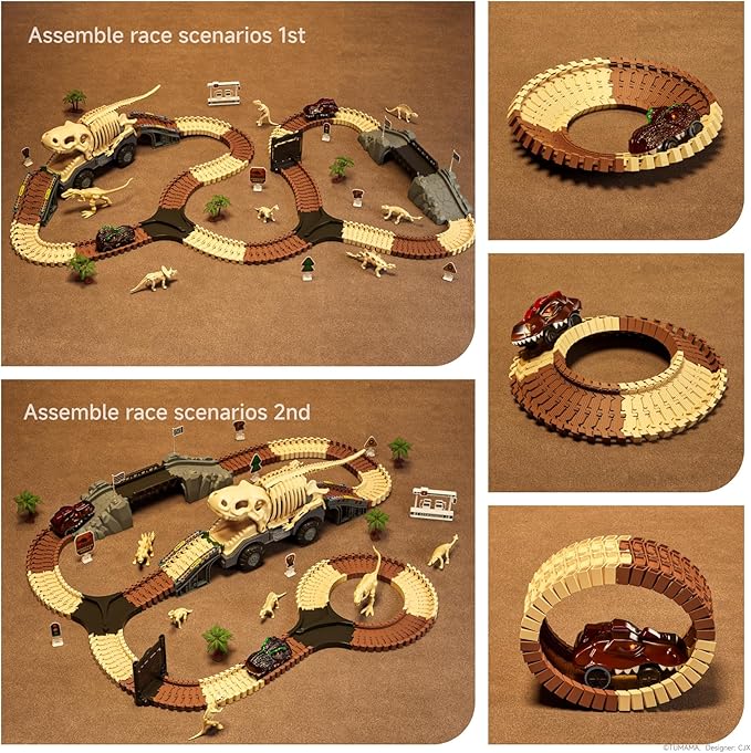 TUMAMA Dinosaur Toys Race Car Track, Flexible Dinosaur Track Toys Set, Create a Dinosaur World Road Race, Birthday for 3 4 5 6 7 Years Old Boys Girls Kids