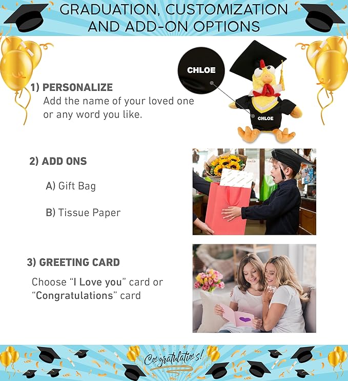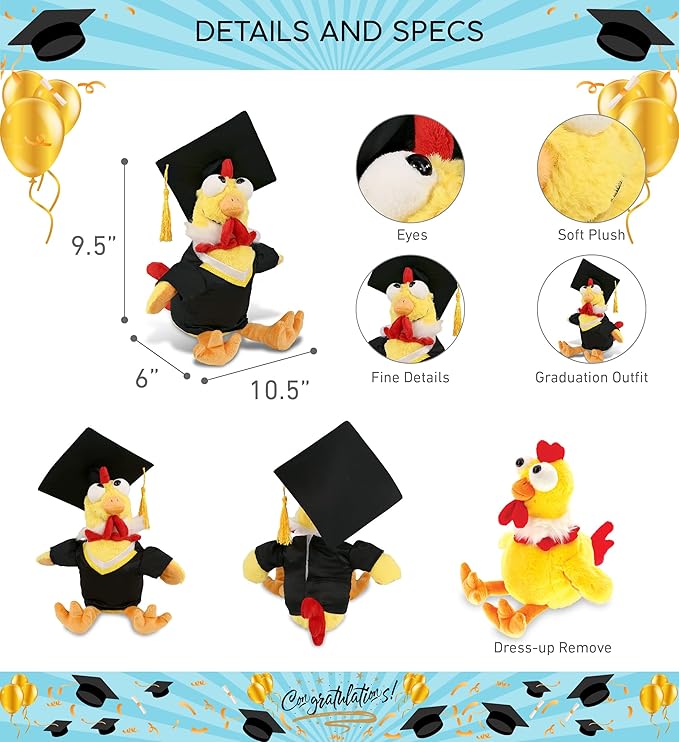 About This PERSONALIZATION, CUSTOMIZATION, AND ADD-ON OPTIONS - Super Soft Yellow Rooster Graduation Plush comes customized with a black graduation... Read more