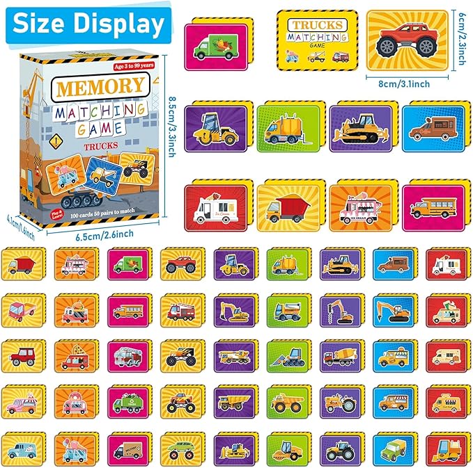 gisgfim 50 Pairs Memory Matching Game Trucks Concentration Memory Card Games for Kids Preschool Educational Ages 3-8 A Fun & Fast Vehicle Theme Matching Games