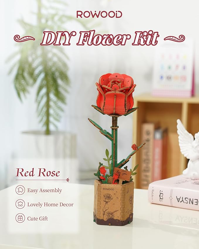 rowood 3D Puzzle Wooden Flower,DIY Artifical Flower Building Toy Set Craft Kit for Women,Mother's Day/Valentine's Day/Teacher's Day/Thanksgiving/Christmas/Birthday Choice-Red Rose