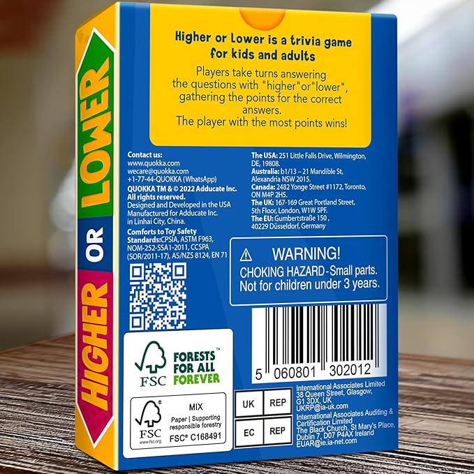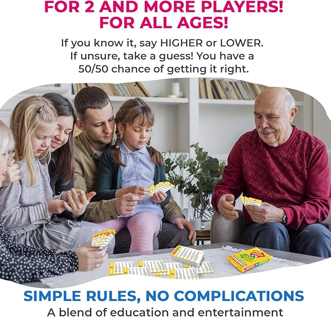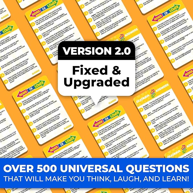 QUOKKA Trivia Board Games for Kids and Adults - Version V2.0 - Family Night Board Game 4xSet Higher or Lower Trivia Cards | Guess Fun Questions | 2 + Players - Challenge Your General Knowledge
