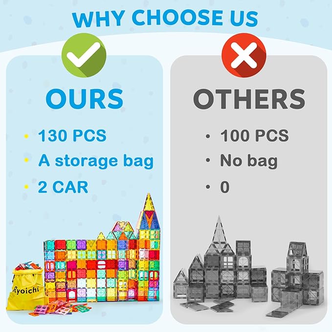 Ryoichi 138PCS Magnetic Building Tiles Set with 2 Cars, STEM Educational Construction Blocks & Montessori Learning Toys for Kids Ages 3-9+ Years