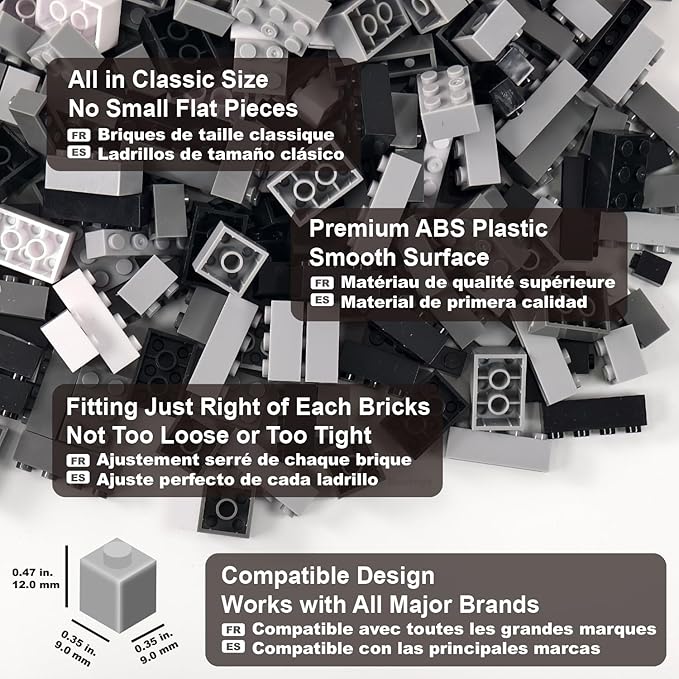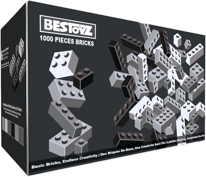 Building Bricks 1000 Pieces in Black, Dark Grey, Light Grey & White, Classic General Building Blocks Toys for Boys & Girls, Bulk Basic Brick Tiles for Adult's Building Projects