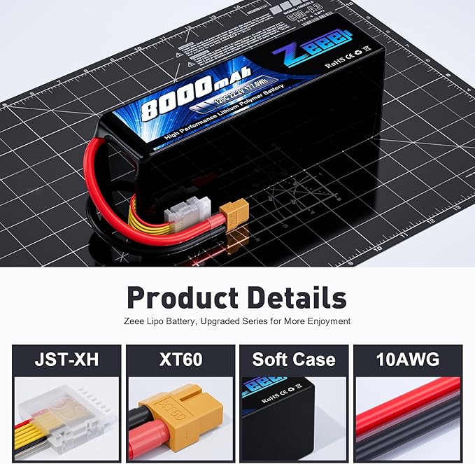 About This 【Zeee 6S 8000mAh RC Lipos Specification】- Battery voltage: 22.2V; Configuration: 6S1P; Cell voltage: 3.2~4.2V; Capacity: 8000mAh; Discharge: 120C;... Read more