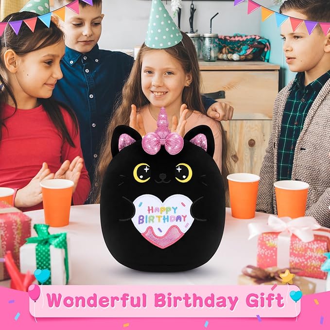 Happy Birthday Gift Black Unicorn Cat Plush Toys-11'' Black Cat Plushies Anime Plush-Kawaii Plushie Toy Stuffed Animals Cute Plushies, Black Unicorn Cat Plush Pillow Birthday Gifts for Kids