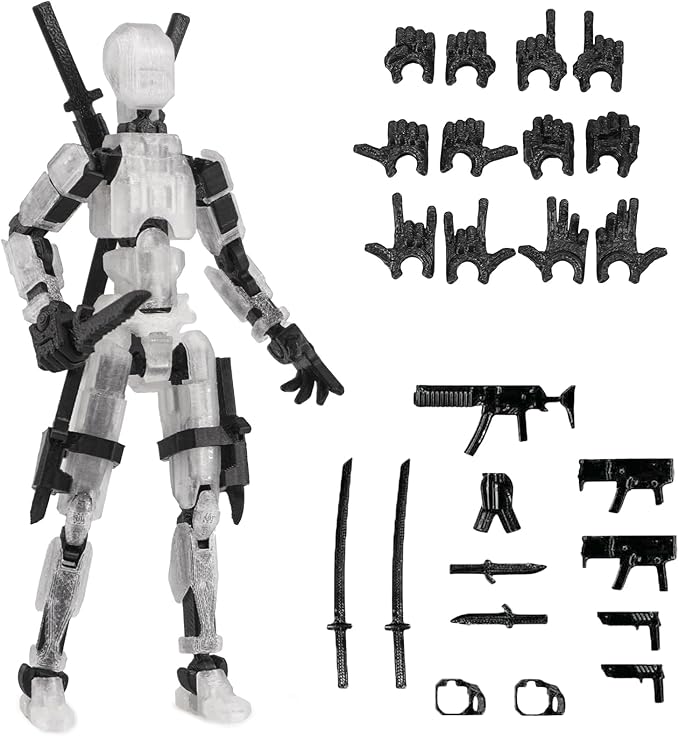 Pre-Assembly 3D Printed 5.54'' Dummy13 Action Figure, Multi-Jointed Tian13, Articulated T13 Desktop Decoration,12 in 1 Accessories, Best Birthday Festival Gift (Crystal+Black)