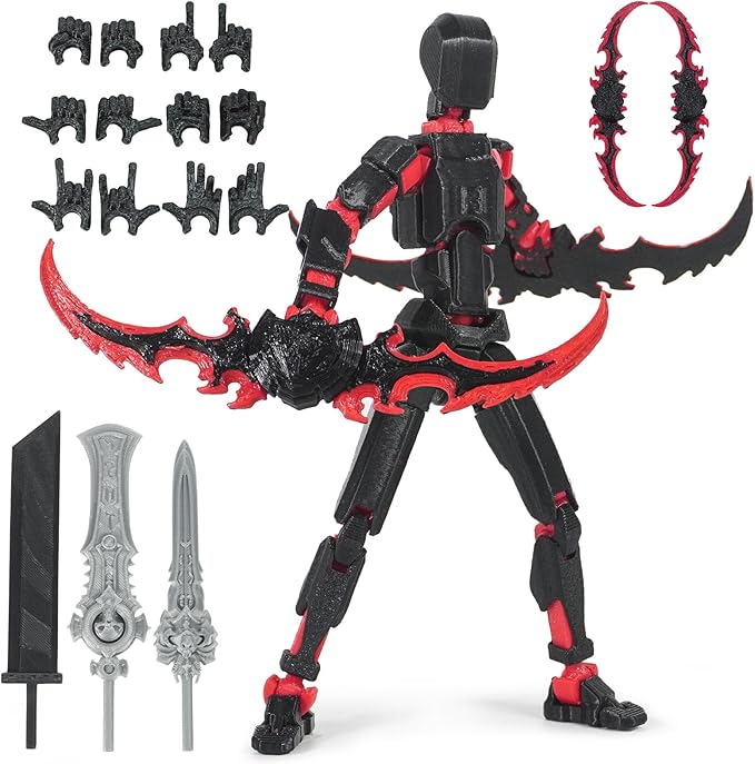 Pre-Assembly 3D Printed 5.54'' Dummy13 Action Figure, Multi-Jointed Tian13, Articulated T13 Desktop Decoration,12 in 1 Accessories, Best Birthday Festival Gift (Black+red)