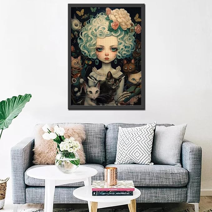 Curly-haired Doll and Cat Jigsaw Puzzle Cool Dolls Girl 1000 Piece Jigsaw Puzzles for Adults Challenging Family Activity Games Colorful DIY for Home Decor 20 x 27 Inch