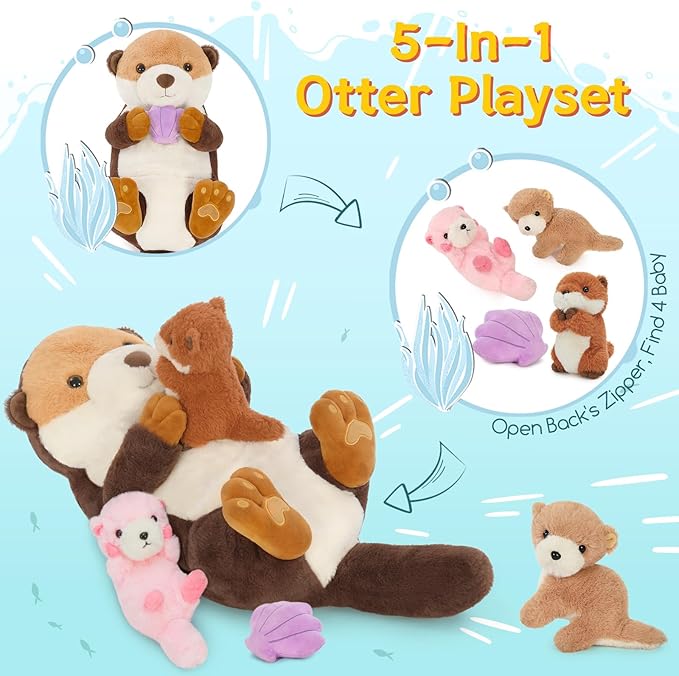 MorisMos 5Pcs Sea Otter Stuffed Animal with Babies,23.6'' Giant Mommy Stuffed Otter with 3 Babies & Plush Seashell, Boy Girl Sea Toys for Kids 3-5 Birthday Christmas Decor