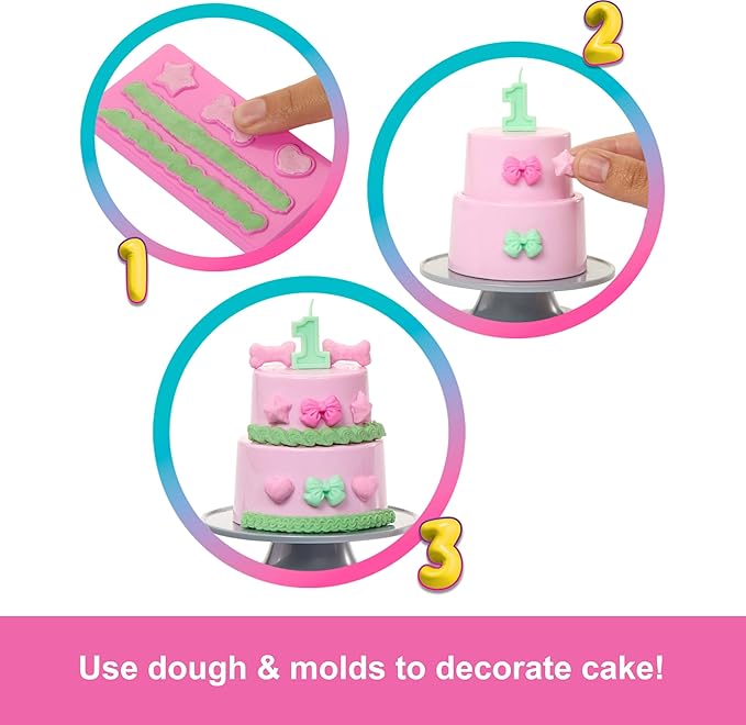 Barbie Party Unboxed Doll & Accessories, Pet Birthday Series Shimmerin’ Hearts Set with 10 Surprises Including Color Change & Cake-Decorating Activity