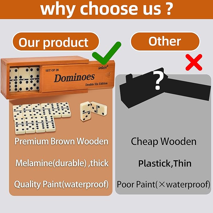 Smilejoy Dominos Set for Adults -Jumbo Size Dominoes Double Six Edition- Classic Board Games- Thick Size Double 6 Domino Set with Deluxe Brown Wood Box, 28 Tiles (2-4 Players)
