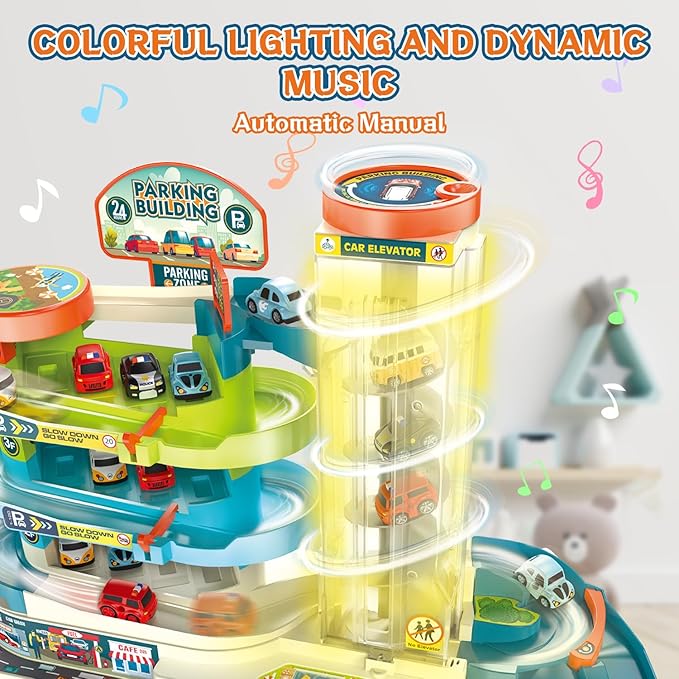 Fisca 2-in-1 Race Car Tracks PlaySet for Kids, Toy Car Ramp Track and Lifting Parking Lot, Dual Mode Toddler Car Track Toy Playset with 6 Cars, Automatic Rotary Elevator, Steering Wheel Music Driving