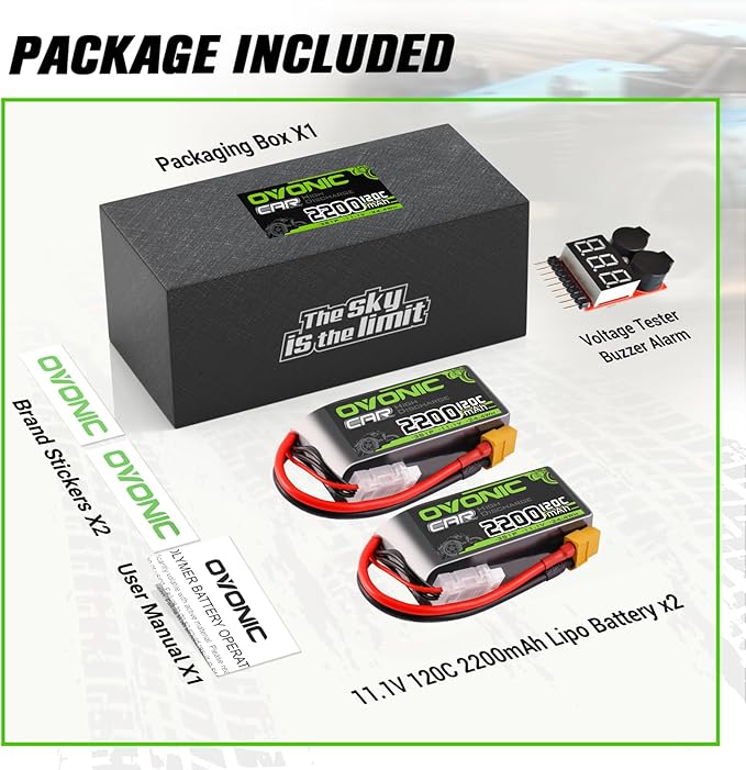 OVONIC 3S Short LiPo Battery 11.1V 2200mAh 120C with XT60 Plug for RC Car RC Truck Airplane Helicopter Boat Car Racing RC Hobby [2 Packs][77" D x 34" W x 26" H mm](with Lipo Voltage Checker)