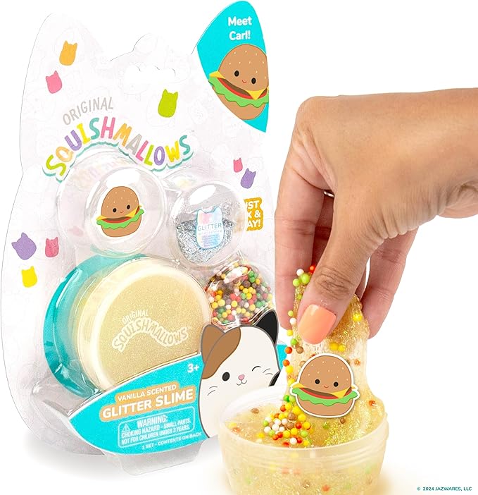 Original Squishmallows Glitter Carl The Burger Charm, Vanilla-Scented Slime, 3 Slime Add-Ins, Pre-Made Sludge Toy for Kids, Great 6 Year Old Toys