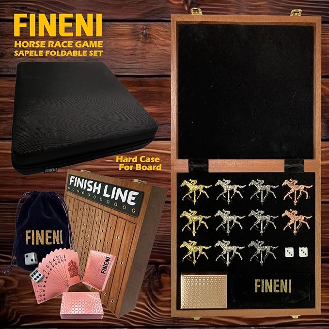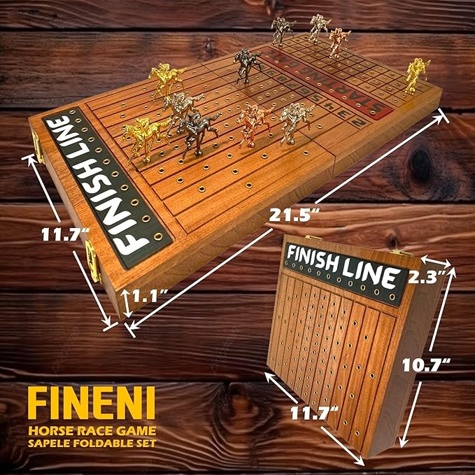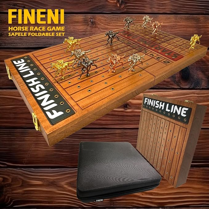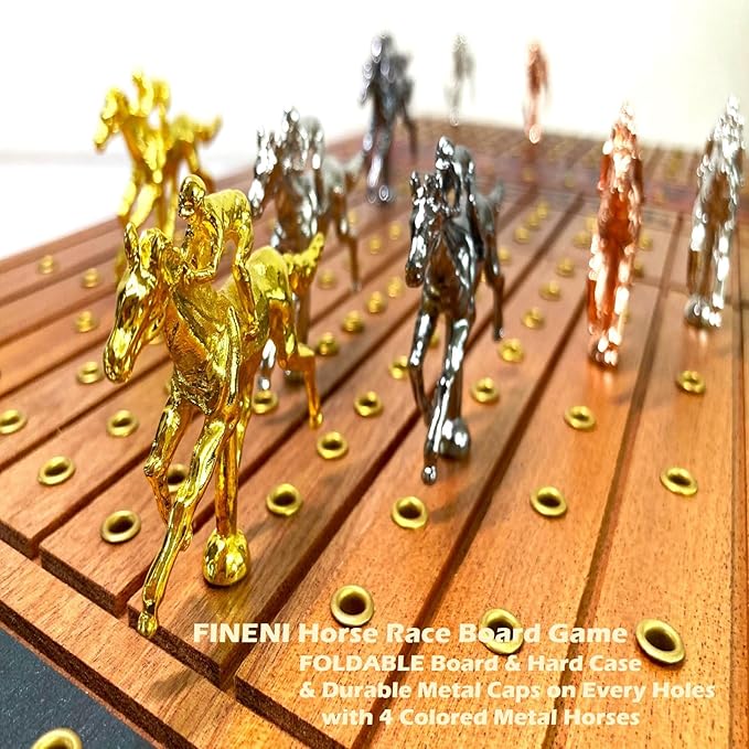 Horse Racing Game for Adults, Foldable Horse Race Board Game with 11 Luxurious Metal Horses (Gold, Silver, Black, RoseGold), 22” Sapele Wood Horse Race Game Board, Dice & RoseGold Card (Sapele)
