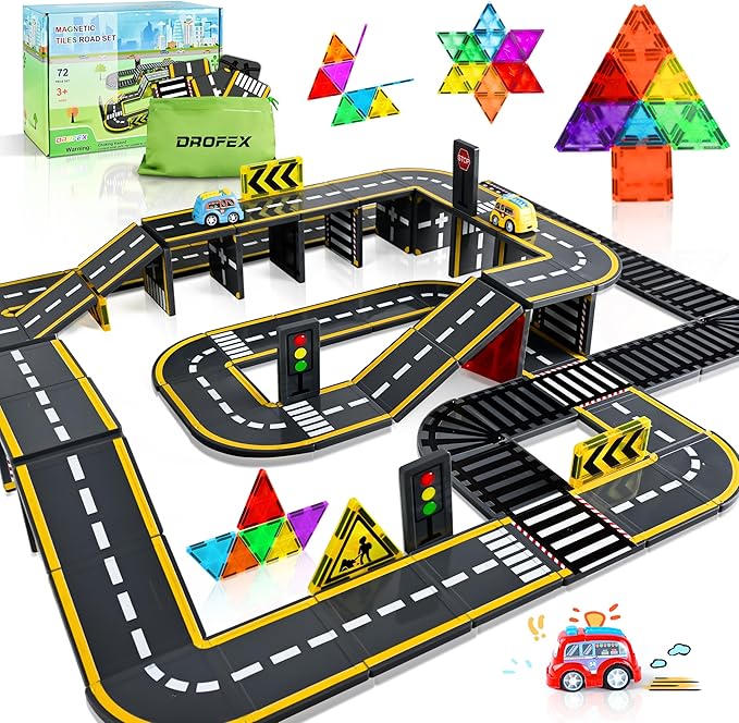 72pcs Upgraded Magnetic Tiles Road & Train Dual-Sided Expansion Pack, Magnetic Building Blocks Construction Toys for 3+Year Old Boys & Girls, Montessori Toys for Toddler, STEM Learning Gifts