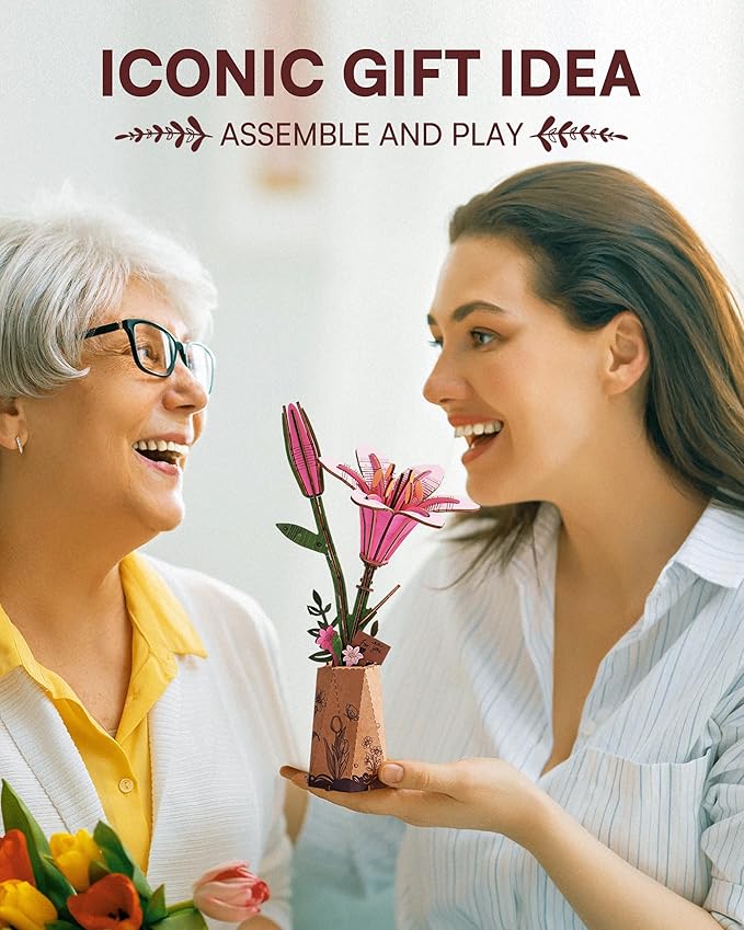 Rowood Wooden Flower Kit,DIY Artifical Flower Building Set Craft Kit for Adults,Mother's Day/Valentine's Day for Mom/Women/Grandma-Pink Lily