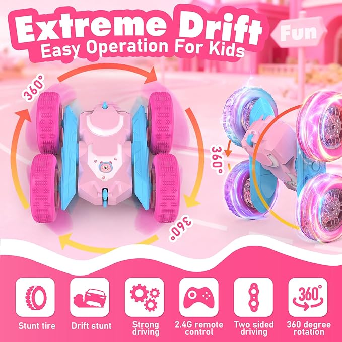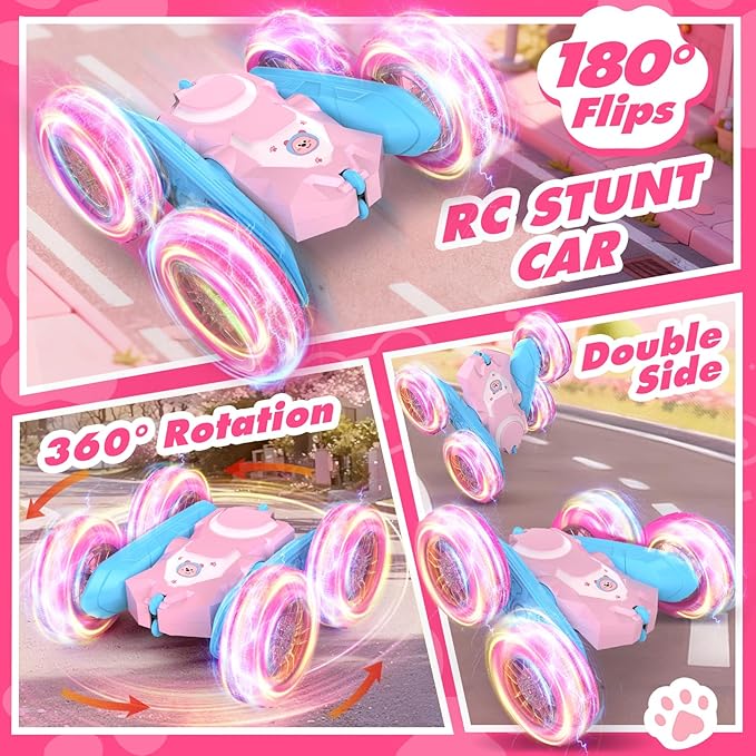 NQD Pink Remote Control Car for Girls, 360° Spin Flip RC Stunt Car with Flashing Wheel Lights 2 Batteries, Double Sided 4WD Off-Road RC Toy Gift for Girls Xmas Birthday