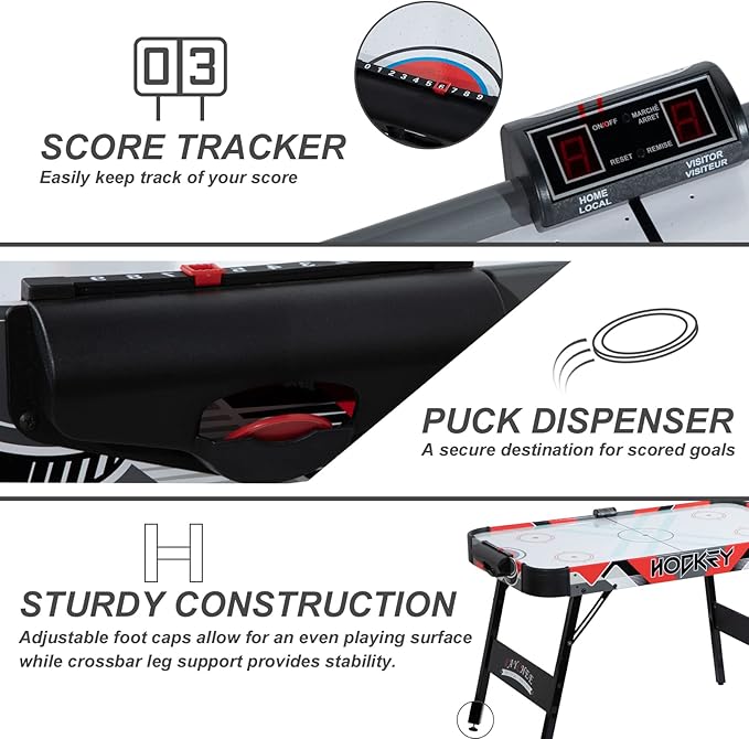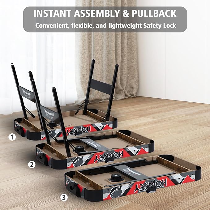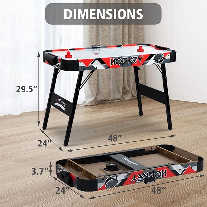 • FOLDABLE AIR HOCKEY TABLE - The upgraded air hockey table is foldable. The portable design greatly saves installation time. If not in use, the air hockey table can be folded up to save room space. A complete package with 2 pushers and 2 pucks. Our air hockey table is perfect for a friendly and enjoyable 2 player game for kids and adults.