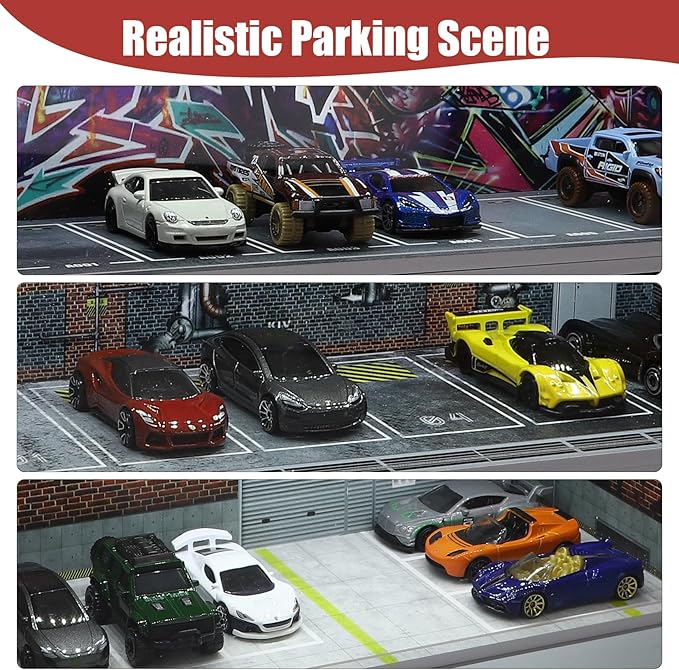 Display Case for Hot Wheels: Stackable Parking Garage for 1/64 Scale Matchbox Toy Car, FoamBoard Storage for Monster Trucks with LED Light and Acrylic Cover, Repair Store