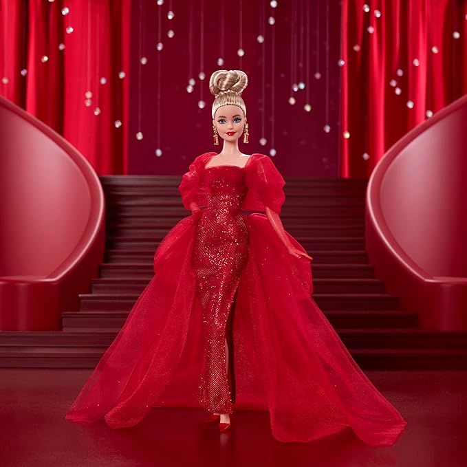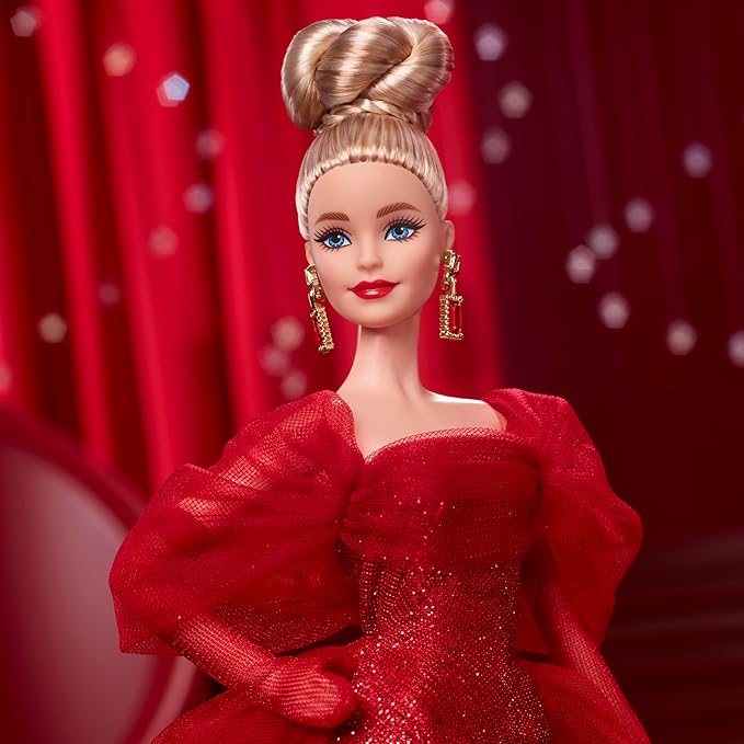 Barbie Signature Doll, Mattel 80th Anniversary Collectible in Glittery Red Tulle Gown with Drop Earrings and Sheer Gloves, Blonde Hair