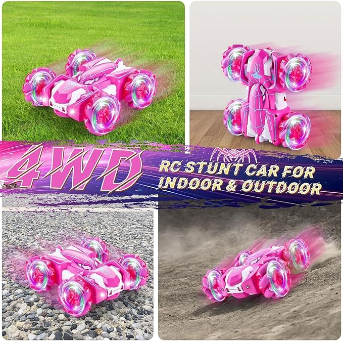 Spider Remote Control Car, Double Sided 360°Rotating USB Direct Charging RC Cars with Cool Lights, 2.4Ghz Drift RC Stunt Car, 360°Rotating 4WD Off-Road Race Toys for 4-12 Boy Girl Kids Gifts(Pink)