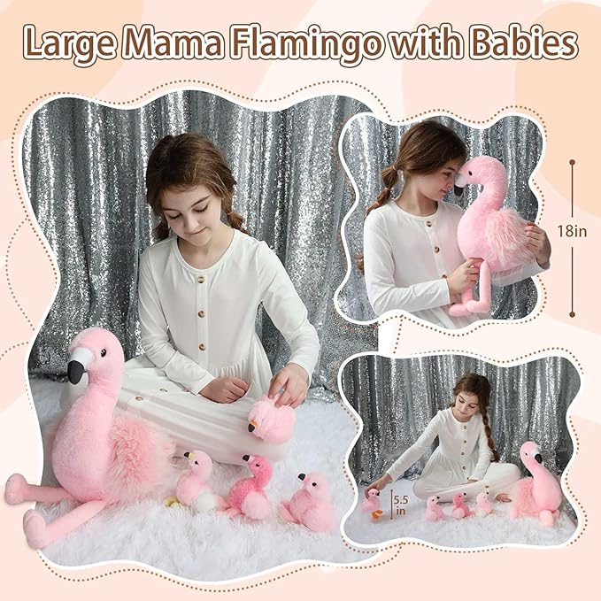 MorisMos Plush Flamingo Stuffed Animals-18in Mommy Stuffed Flamingo with 4 Baby Bird Toys for Girls Boys,Pink Bird Stuffed Animal Gift for Kids Women Birthday Decor Baby Shower Christmas