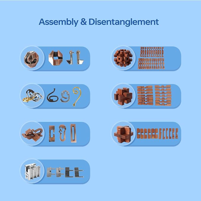 7 Pieces Cool Unlock Interlock Brain Teaser Puzzles Retro Wooden and Metal Puzzles IQ Logic Fun Puzzle Box Challenge Game