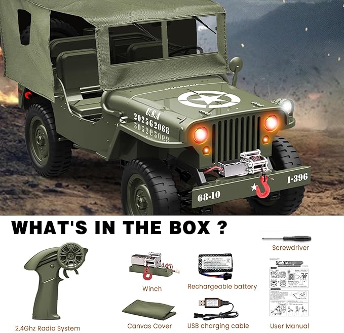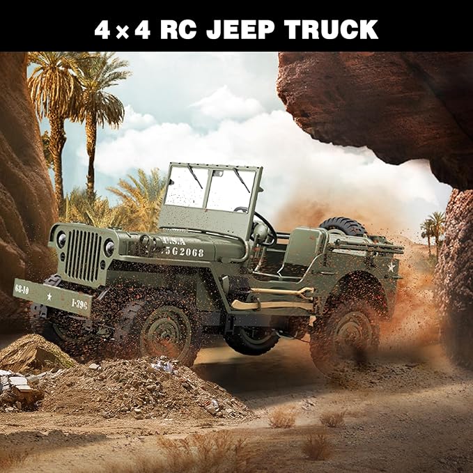 Remote Control Truck, RC Willys Military Jeep Car 1/12 Scale with Rechargeable Battery & Winch System, 2.4Ghz 4x4 Off-Road Remote-Control Crawler Vehicle for Boys Adult, Christmas Birthday Gift