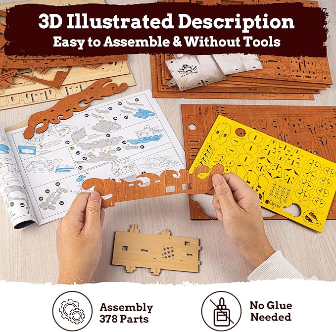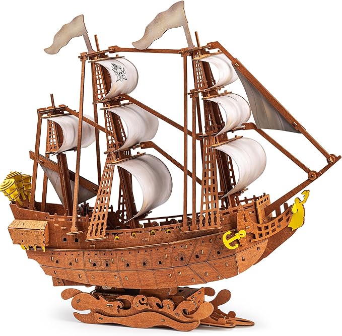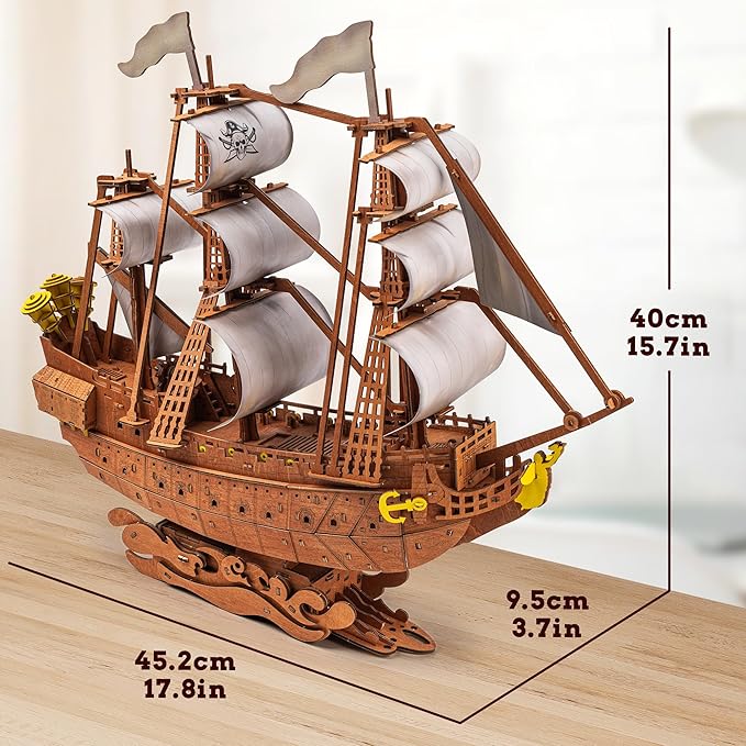 SYNARRY Wooden 3D Puzzles for Adults Teens, LED Pirate Ship Home Decor Gifts for Men Women Model Kits Brain Teaser Wooden Puzzles for Adults Teacher Gifts, Queen Anne's Revenge 378 Pcs