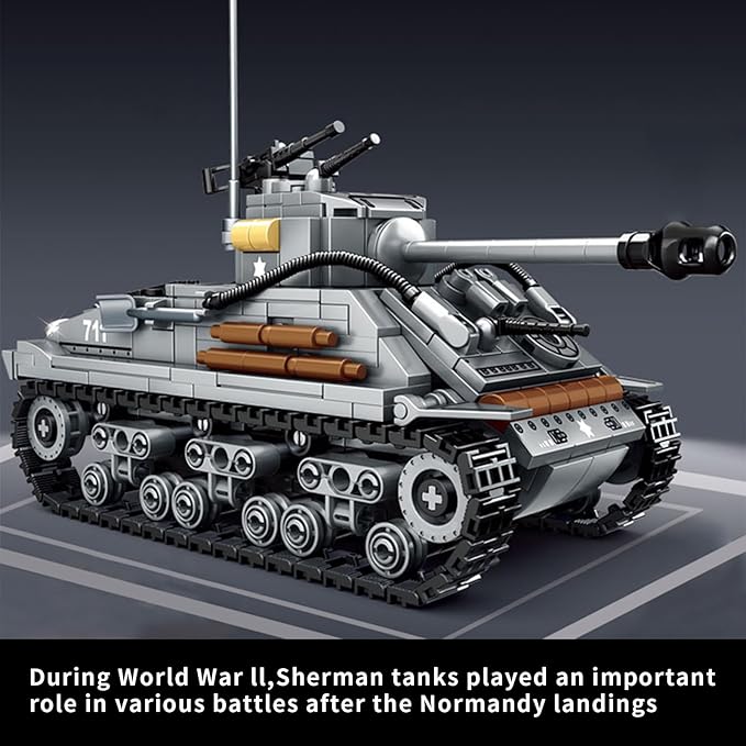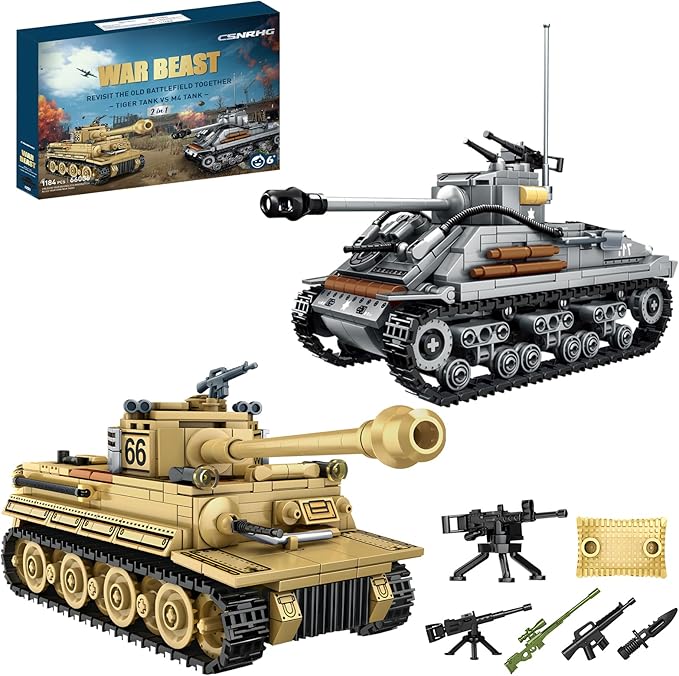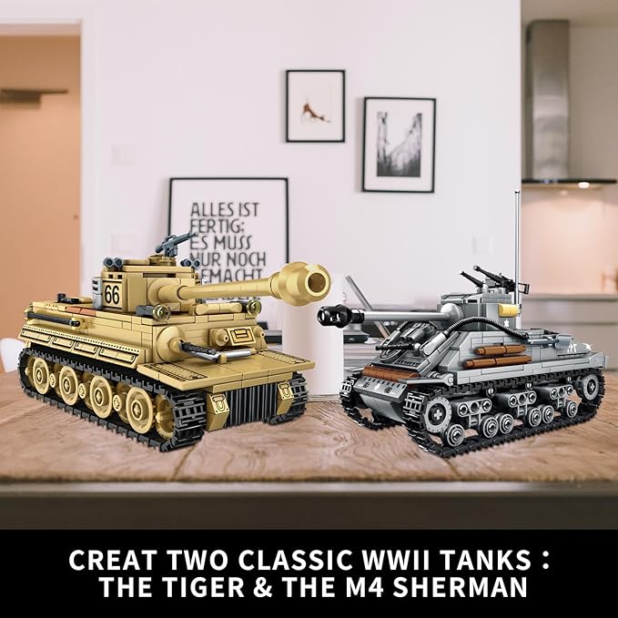 WW2 2 in 1 Army Tank Building Blocks Kit Create an American M4 Sherman & a German Tiger Tank Military Toy Sets Birthday for Age 6+ Children Teens Adults 1184 Pieces