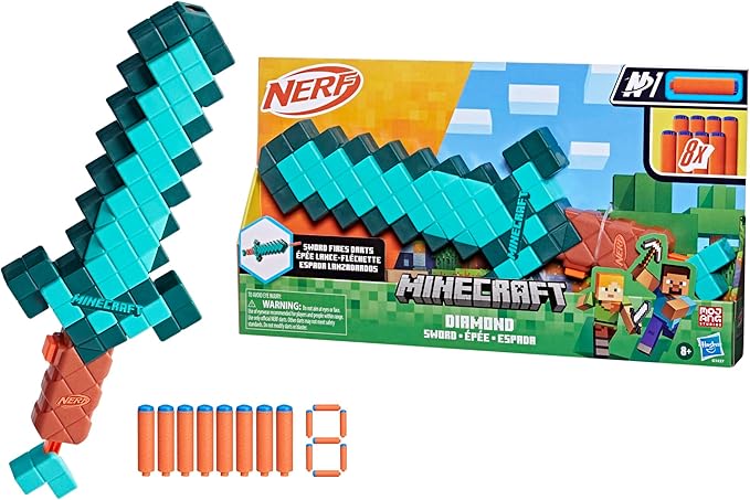 Nerf Minecraft Sword Dart Blaster, Pull Back Priming, Foam Edge, 8 N1 Darts, Ages 8+