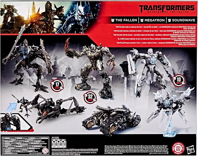 About This TRANSFORMERS: REVENGE OF THE FALLEN FIGURE 3-PACK: The pack includes The Fallen, Soundwave, and Megatron action figures that... Read more