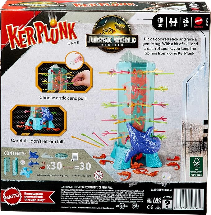 About This The KerPlunk game kids love featuring Spinosaurus figures inspired by Jurassic World Rebirth Roll the die to know... Read more