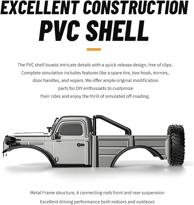 • Excellent off-road performance: The appearance continues the pickup truck simulation details, and the power adopts a high-torque external carbon brush black leather motor, 20A waterproof brush electric regulator, so that the car can burst out with strong output force, low linear posture, can run and climb. It can conquer various terrains, including sand, rocks and roads.