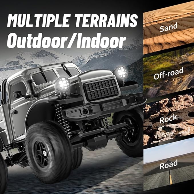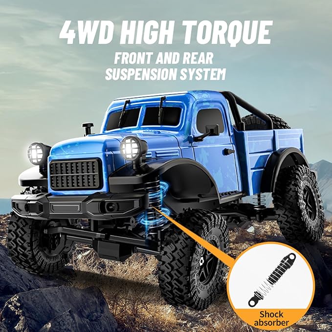 • High Visibility and Safety Features: Equipped with high-brightness front and rear LED lights, this remote control crawler ensures visibility during dusk and night adventures, providing an added layer of safety while driving.(7.4V 500mAh battery, 40 minutes play time)