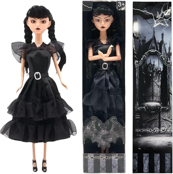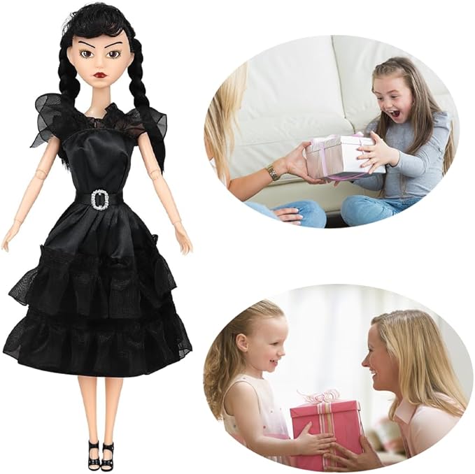 11.5'' Addams Doll with Gift Box, High Heels, Black Dress, and Hair, Perfect Christmas and Birthdays Toy Gift for Girls & Fans(A2)