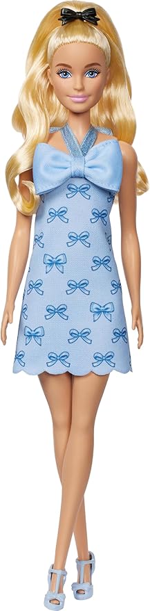 Barbie Fashionistas Doll #237 with Wavy Blonde Ponytail Wearing Blue Bow Halter Dress, Black Hair Bow Accessory and Matching Blue Heels