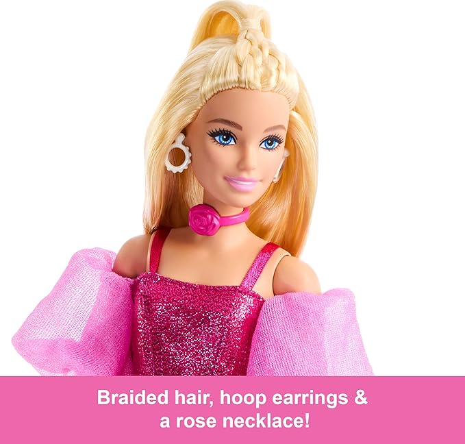 Barbie Deluxe Style Doll #5 in Metallic Pink Outfit, Blonde Hair, Sparkly Corset Top and Shiny Pants with Accessories Like Rose Necklace and Handbag