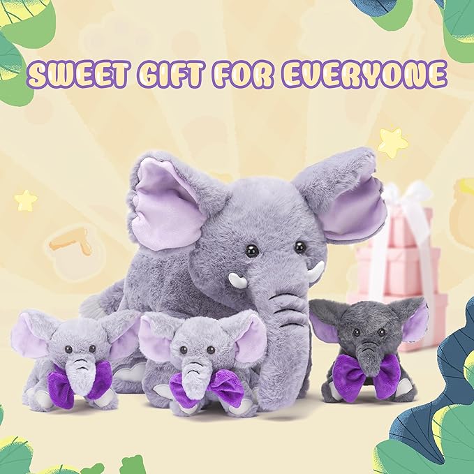 IKASA Mommy Elephant Stuffed Animal Mom and Baby Plush Toy, Cute 17" Soft Small Mama Family Set Cuddly Toy with Little Mini Babies,Gifts for Kids