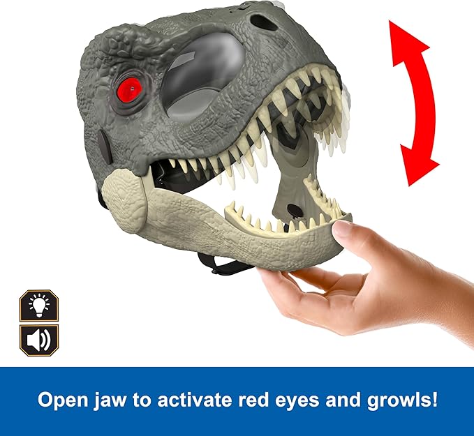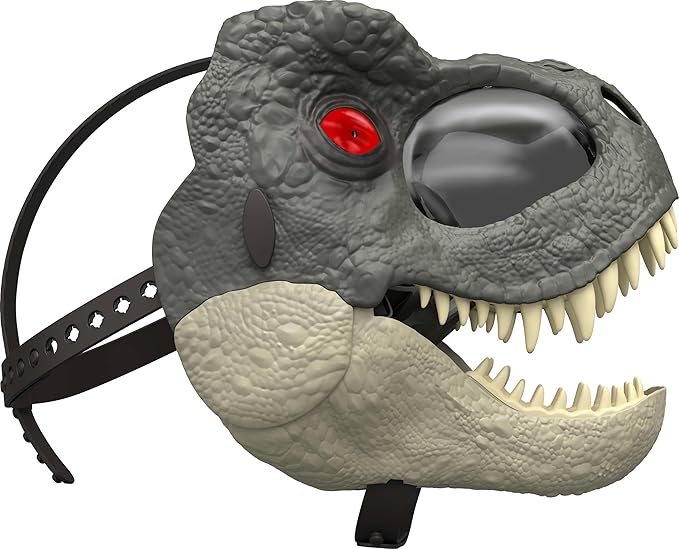 Mattel Jurassic World Rebirth T-Rex Rage N Roar Mask with LED Light Up Eyes, Blink Action with 3 Level Aggression Effect, Dinosaur Costume Headgear Toy