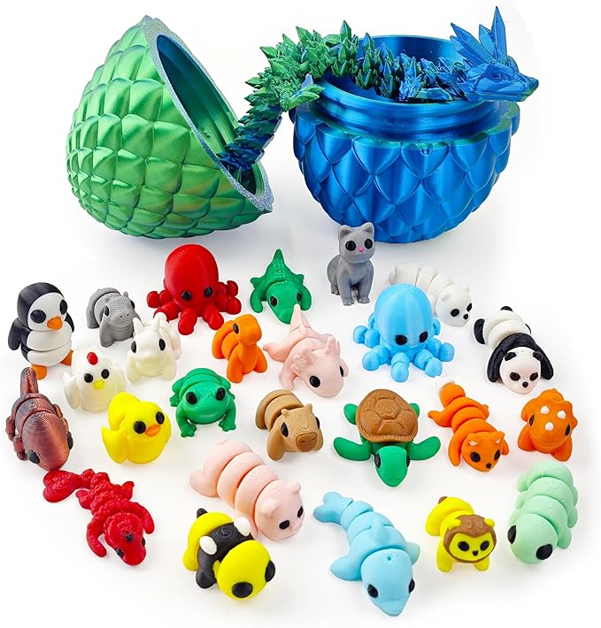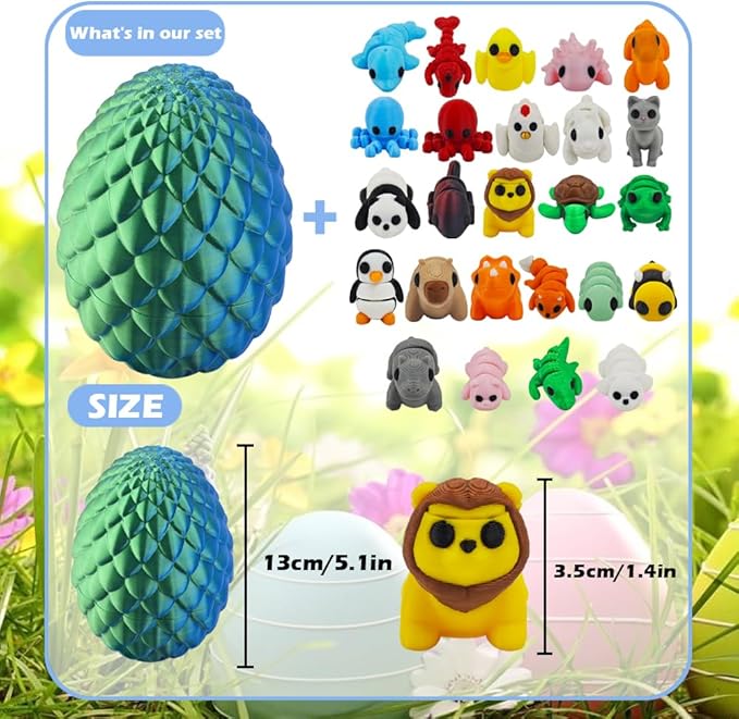 26PCS Mini 3D Printed Animal Figures Set and Dragon Eggs with 12In Dragon Inside, Premium 3D Printed Fidget Toys for Kids, Fun Party Favors, Unique Collector's Gift Set, Cute Desk Decor