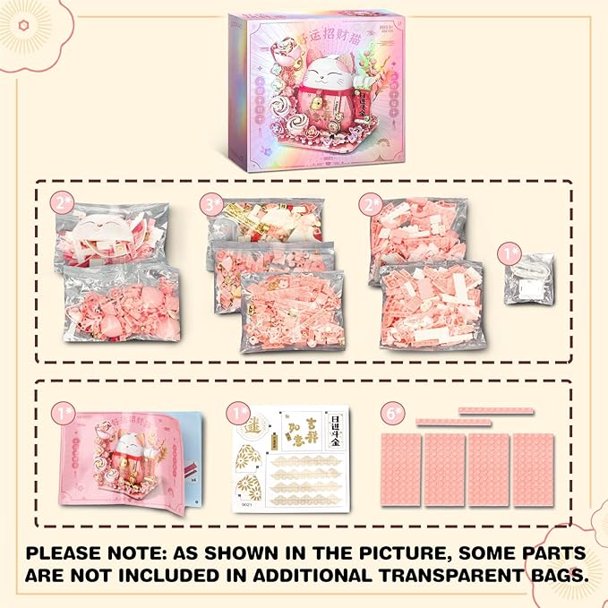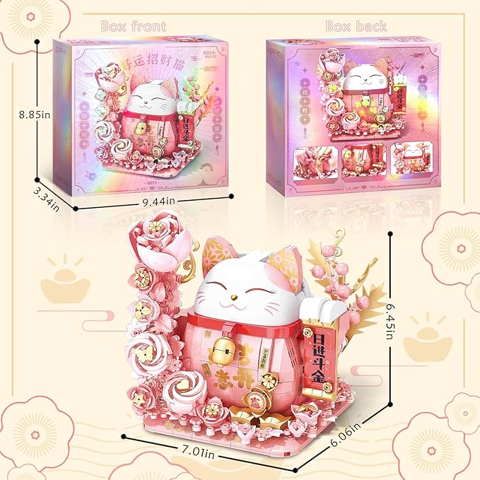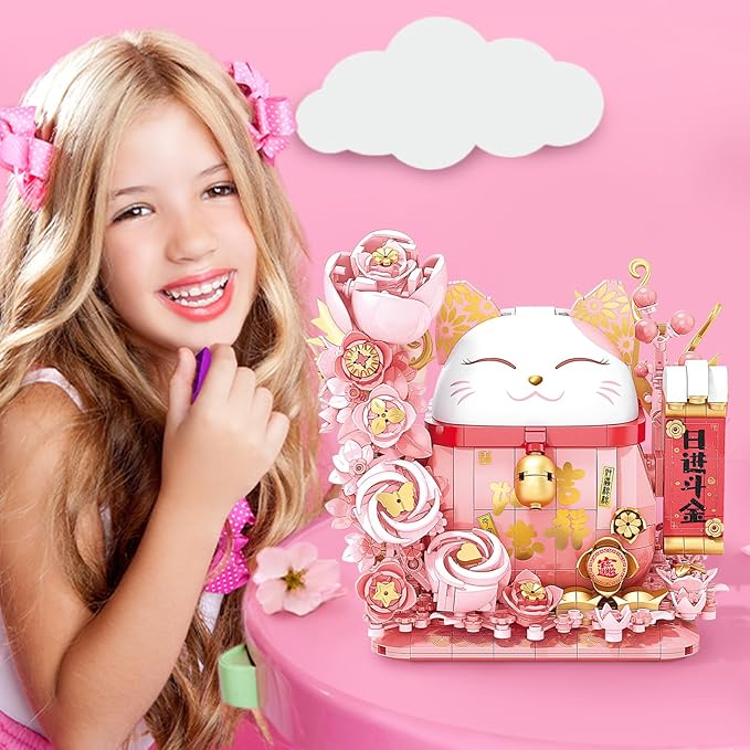 Lucky Cat Building Block Set, Compatible with Lego Cat, 868Pcs Cute Fortune Cat with Flowers Building Blocks, Christmas Birthday Creative Gift for Girls Boys Adult (Pink Cat)