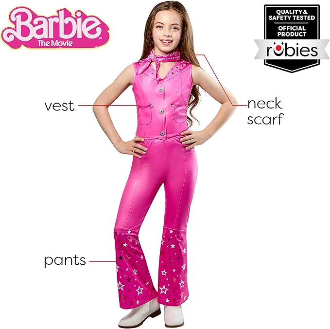 About This COSTUME INCLUDES: Vest, Pants, Neck Scarf OFFICIALLY LICENSED: Barbie Movie Cowgirl Barbie. THE RIGHT FIT: Girls size small... Read more