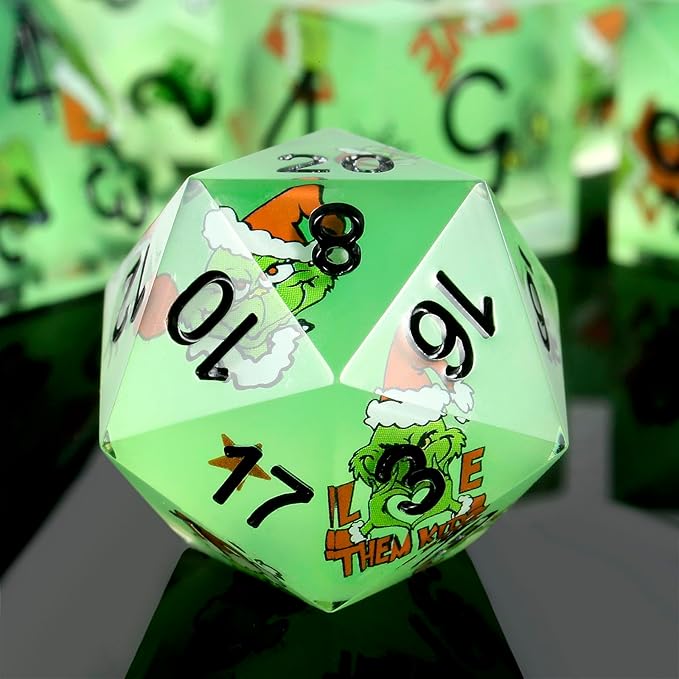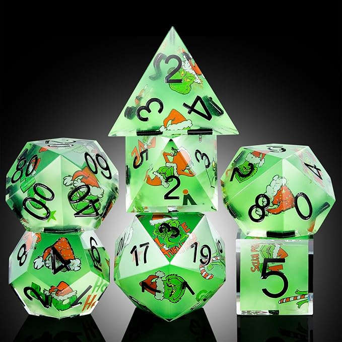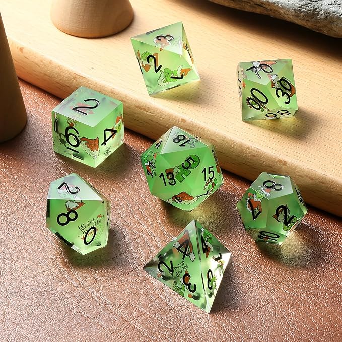 DNDND Full 7 Piece Sharp Edge Dice Set with Carton Stickers for Dungeons and Dragons D&D Table Games (Green with Carton)