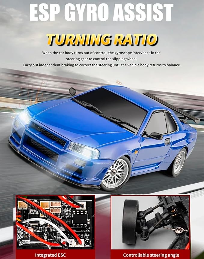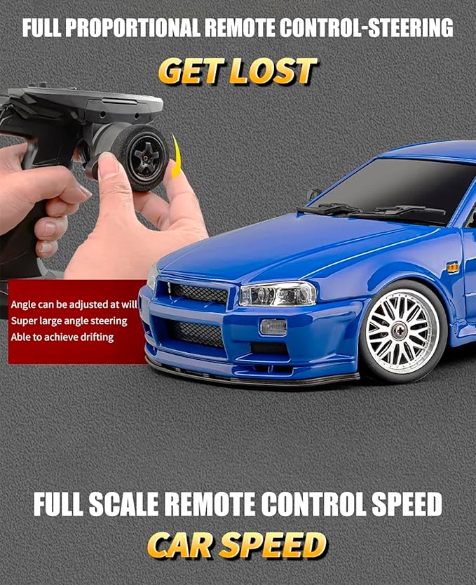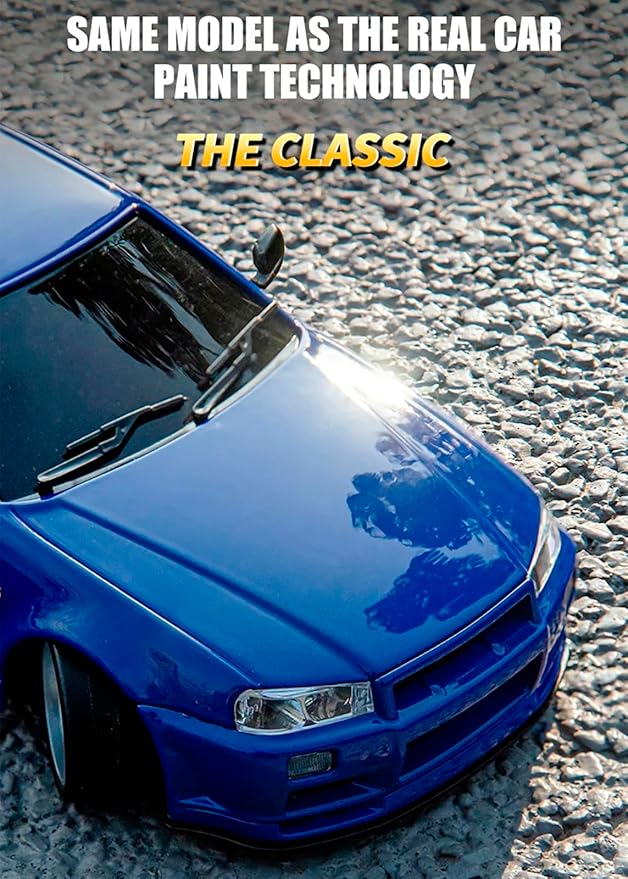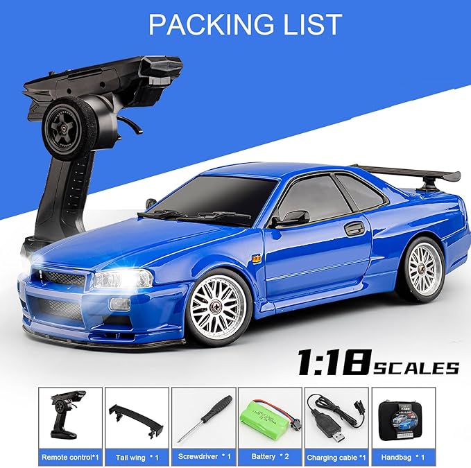 LD1899 1:18 RC Drift Car GTR R34 2.4GHz RWD with Gyroscope on-Road Alloy Body Shell Racing Cars Radio Control (Blue)